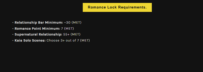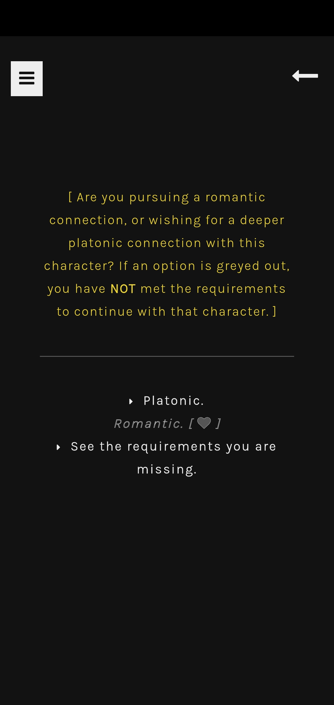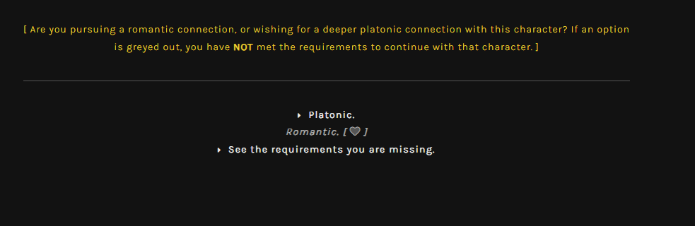 Uhm, I think there's a bug with the romace thing, when it gives the choice of platonic or romantic, it didn't let me choose the romance in any of the routes and when I clicked to see what requirements I was missing this appeared.