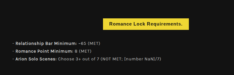 Hello, for the errors when it comes to the romance lock (Number NaN or $romancescenes), I wanted to ask if you would be okay with showing which specific lines in the code of the savefiles are important for the specific requirements of the soloscenes, like that people could maybe try fixing their savefiles, if that's not possible or the problem just lies elsewhere it's totally fine though!